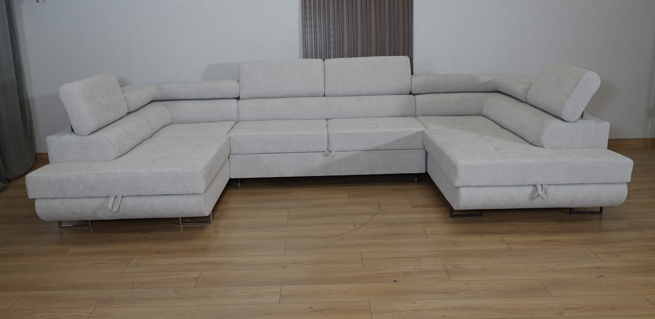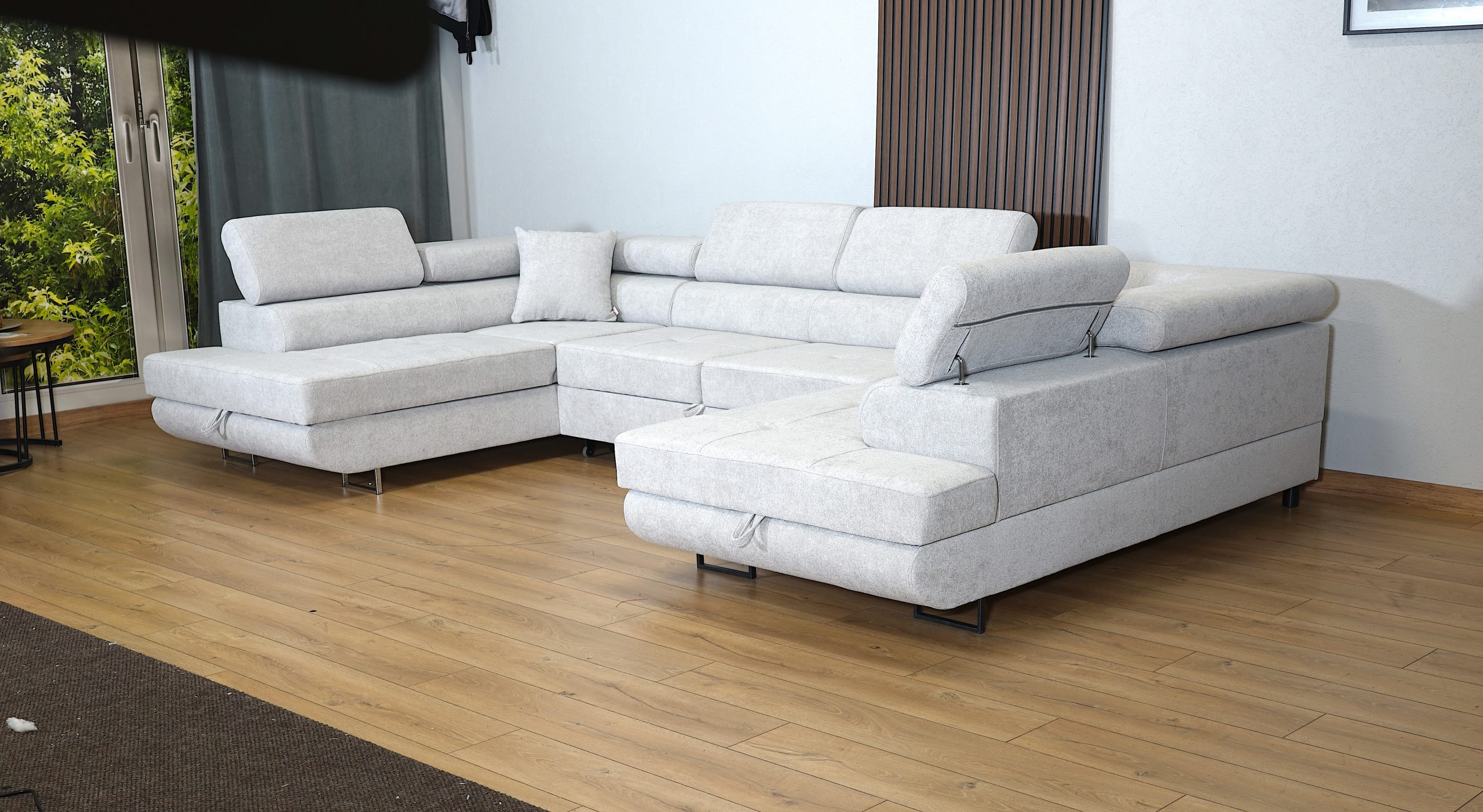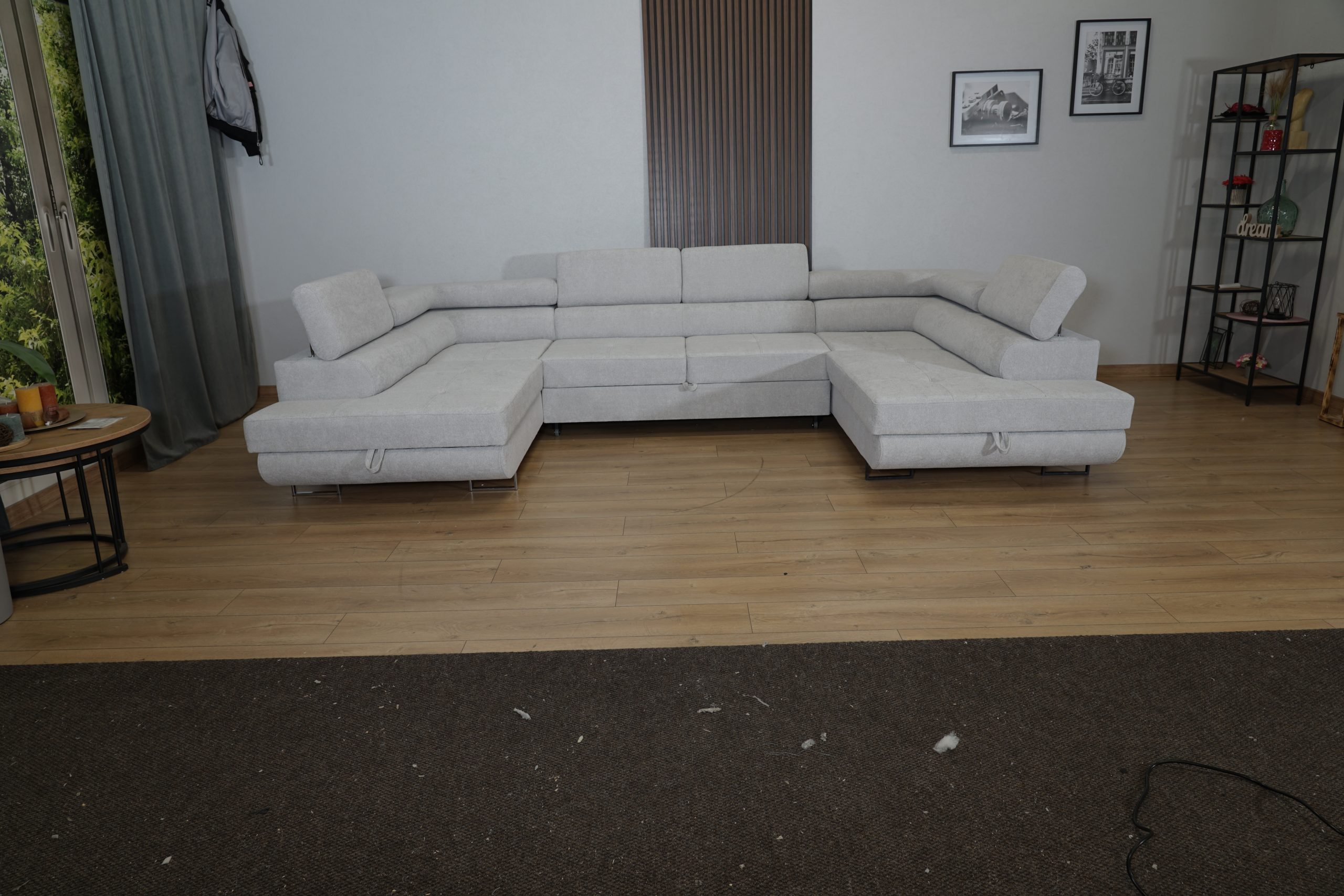 Big Solid-Back U-Shape Sofa Bed Oston v2, a comfortable corner sofa with four adjustable headrests, thanks to the multi-level adjustment system. Comfort and rest are ensured by T35 high-resilience foam and a sinuous spring, ensuring the foam retains its original shape for years to come. The entire structure is supported by high quality wood, ensuring stability during use. This model combines modern form with functionality. High steel legs add to its charm, making it easy to clean under the sofa.