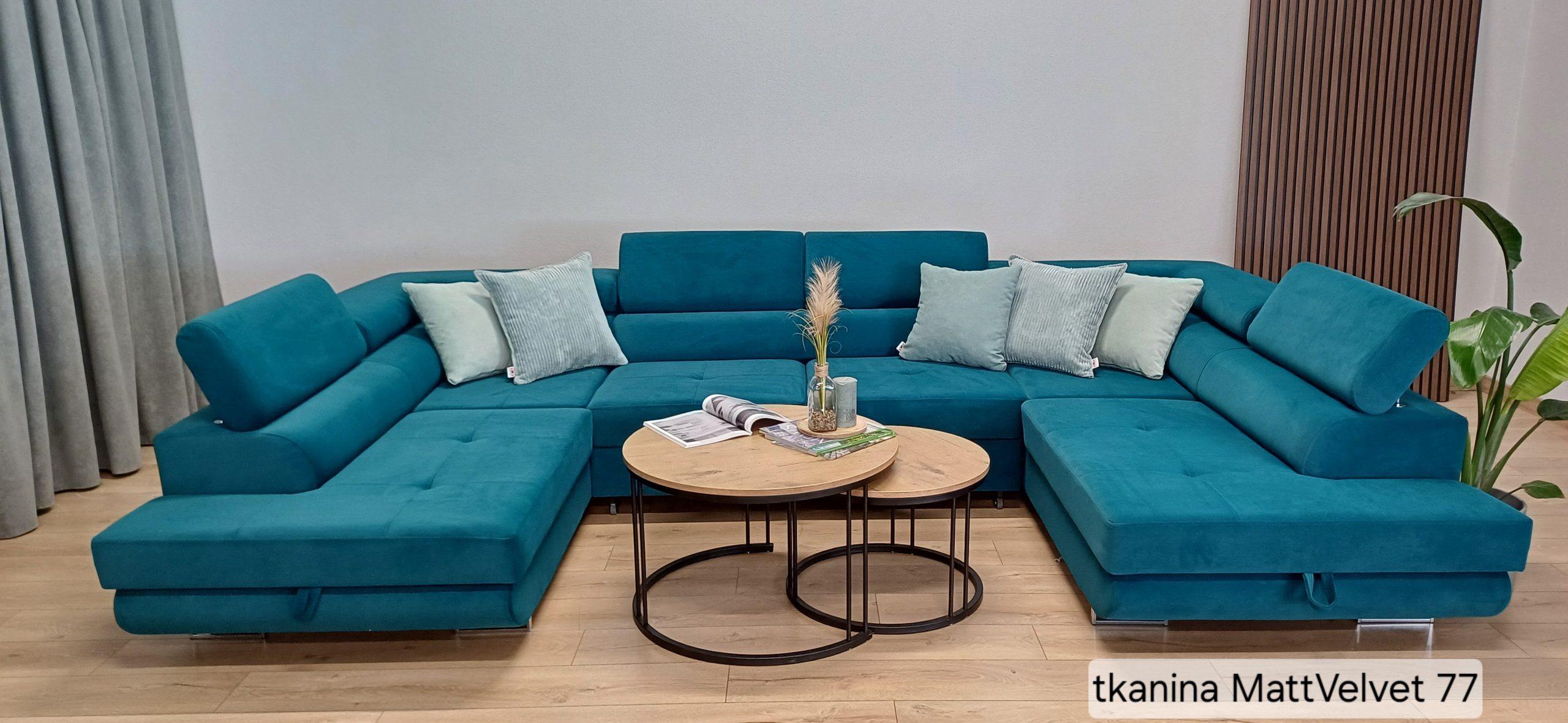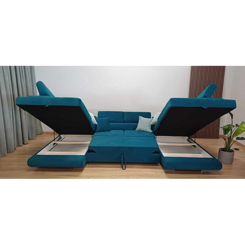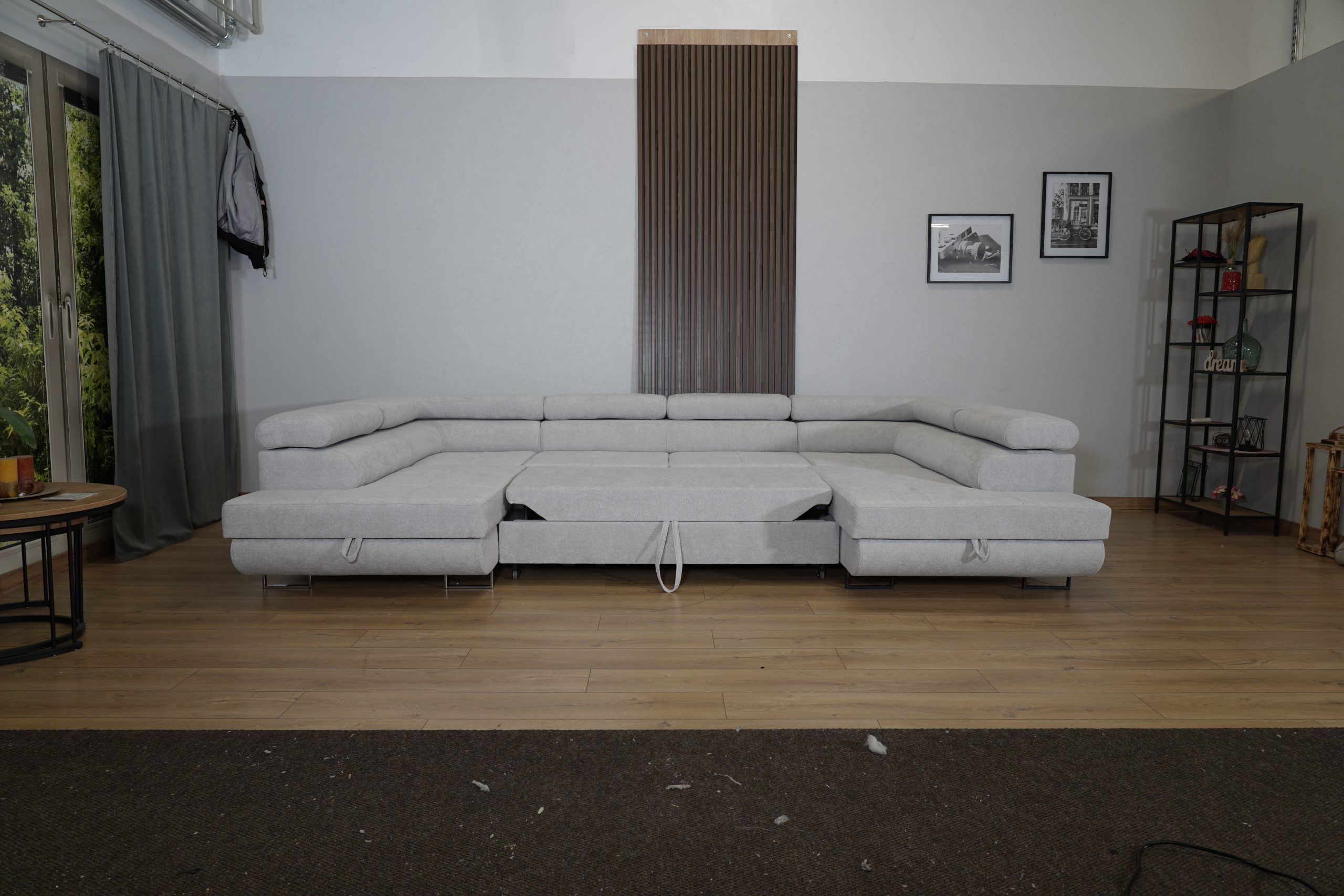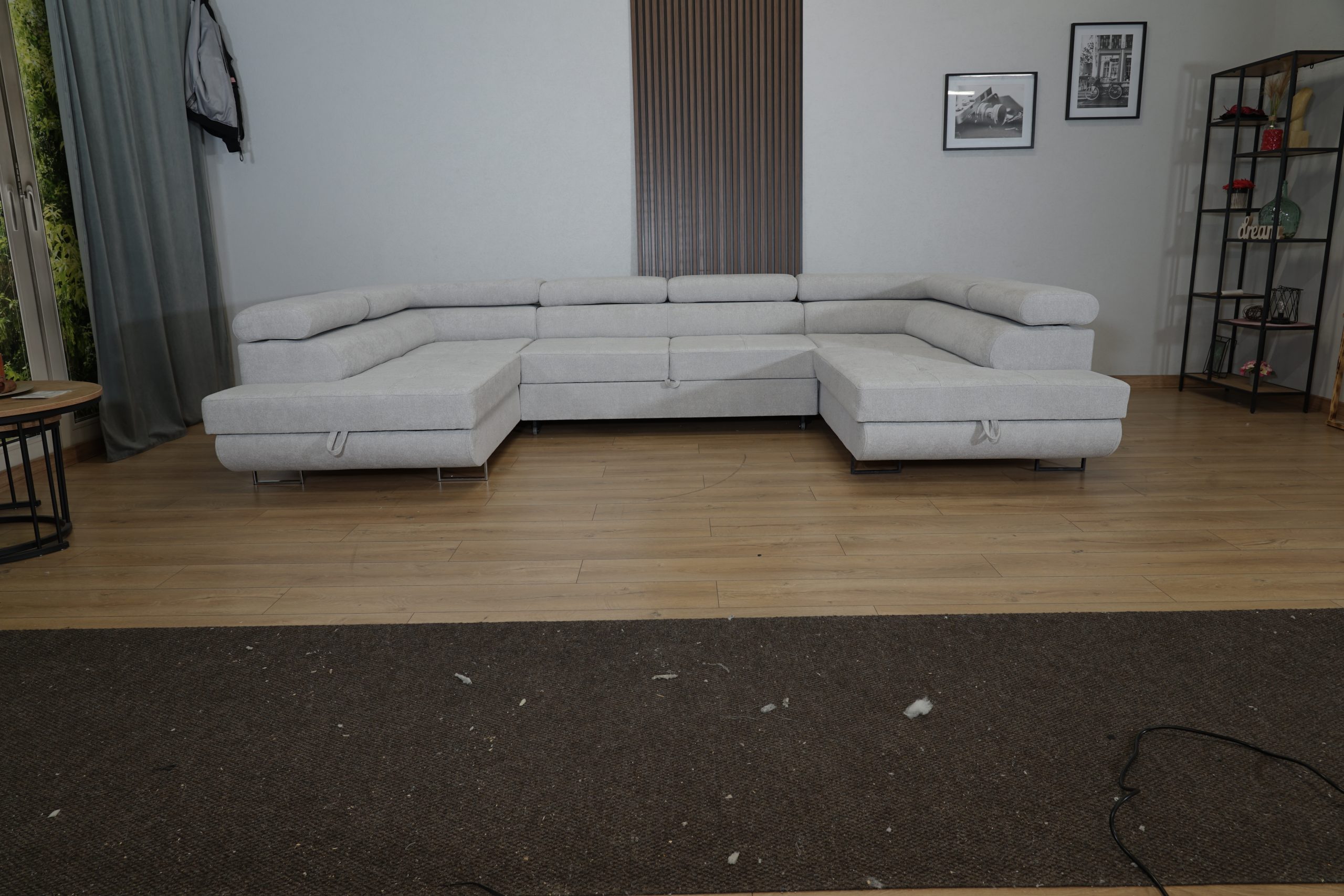 Big Solid-Back U-Shape Sofa Bed Oston v2, a comfortable corner sofa with four adjustable headrests, thanks to the multi-level adjustment system. Comfort and rest are ensured by T35 high-resilience foam and a sinuous spring, ensuring the foam retains its original shape for years to come. The entire structure is supported by high quality wood, ensuring stability during use. This model combines modern form with functionality. High steel legs add to its charm, making it easy to clean under the sofa.